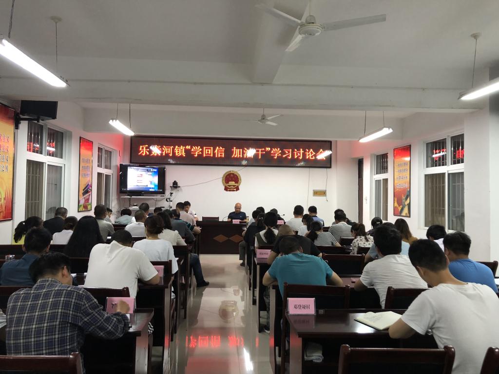 5月15日晚,下村入户归来乐素河镇全体干部整齐划一坐在会议室,加班开展学习活动,专题学习习近平总书记对略阳县徐家坪灾区群众寄语问候精神和省委书记胡和平同志来略座谈会讲话精神。